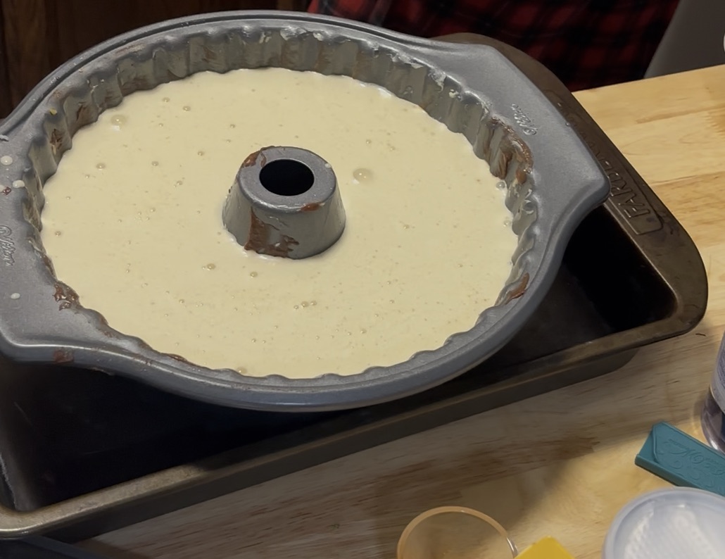 - Scoop the cake batter into the bundt pan. Spread evenly with a spatula.